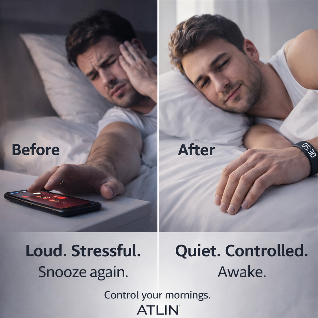 ATLIN WakeBand™ is a silent vibrating alarm worn on your wrist. Instead of loud phone alarms, it wakes you with a focused vibration so you can start your morning calmly, stay consistent, and avoid disturbing anyone around you.
